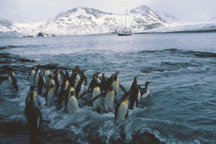 Kongepingviner på Syd Georgia med SY Golden Fleece i bakgrunnen